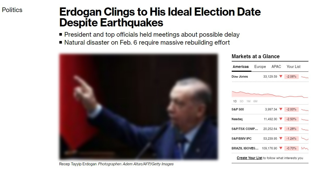 Bloomberg kaynaklı haberde, “Erdoğan zelzelelere karşın istediği seçim tarihinde ısrarcı” başlığını kullanırken Cumhurbaşkanı Erdoğan ve kurmaylarının seçimin ertelenmesi ile ilgili görüşme yaptığı belirtildi.