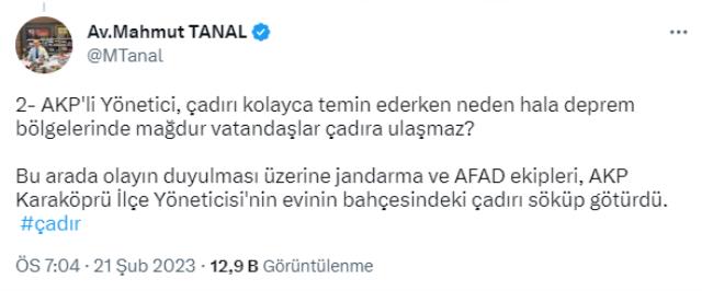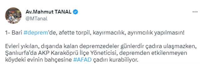 CHP İstanbul Milletvekili Mahmut Tanal, Twitter hesabından bir fotoğraf paylaşarak, Şanlıurfa’da AK Parti Karaköprü İlçe Yöneticisi’nin konutunun bahçesine AFAD çadırı kurduğunu sav etti.