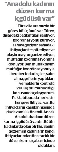 Dağıtıma istekli olarak dayanak veren lojistik firması da var, gönül­lü motokuryeler de bakanlık araçları da mevcut. Her mutfakta 20-30 gö­nüllü çalışıyor. İstekli şeflerimiz de var, telefonlara bakıp bildirileri yanıt­layanlar da var. Her basamakta deste­ğe muhtaçlığımız var. İstekli gelenler ortasında bir bayan yoğunluğu var. Ki­mi vakit patates soyuyorlar temiz­lik yapıyorlar. Mutfağın neye muhtaçlığı varsa el birliği ile çözümlüyoruz.