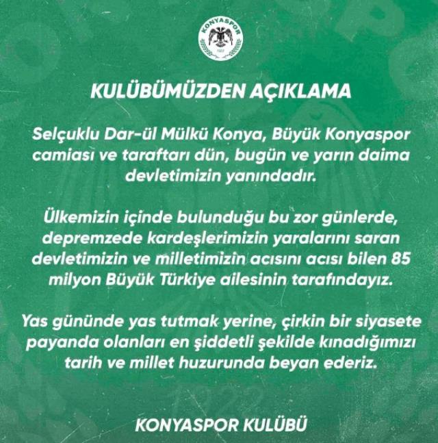 “Selçuklu Dar-ül Mülkü Konya, Büyük Konyaspor topluluğu ve taraftarı dün, bugün ve yarın hep devletimizin yanındadır. Ülkemizin içinde bulunduğu bu sıkıntı günlerde, depremzede kardeşlerimizin yaralarını saran devletimizin ve milletimizin acısını acısı bilen 85 milyon Büyük Türkiye ailesinin tarafındayız. Yas gününde yas tutmak yerine, yakışıksız bir siyasete payanda olanları en şiddetli halde kınadığımızı tarih ve millet huzurunda beyan ederiz.”
