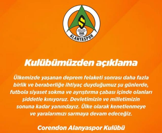 “Ülkemizde yaşanan sarsıntı felaketi sonrası daha fazla birlik ve beraberliğe gereksinim duyduğumuz şu günlerde, futbola siyaset sokma ve ayrıştırma gayreti içinde olanları şiddetle kınıyoruz. Devletimizin ve milletimizin sonuna kadar yanındayız. Ülke olarak kenetlenmeye ve yaralarımızı sarmaya devam edeceğiz.”