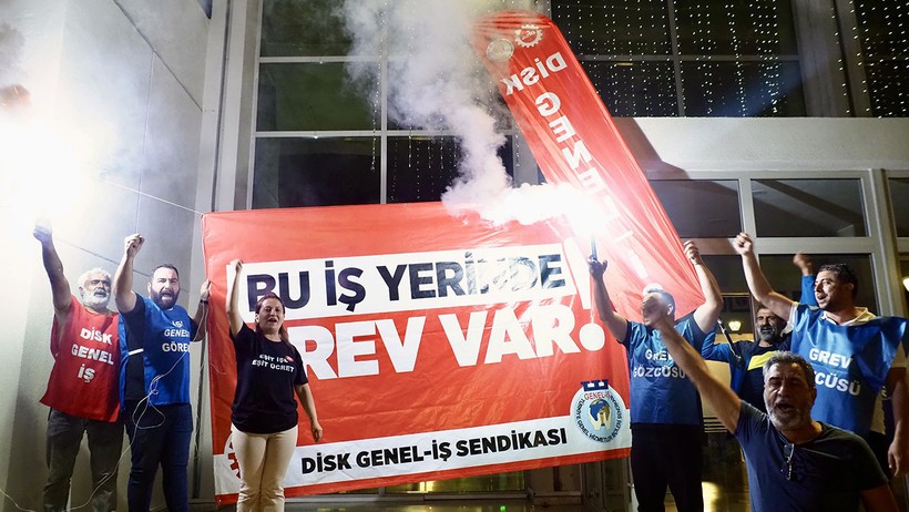 Meşale yakan, çeşitli sloganlar atan ve halay çeken emekçiler, daha sonra “Bu iş yerinde grev var” yazılı pankart açtı.