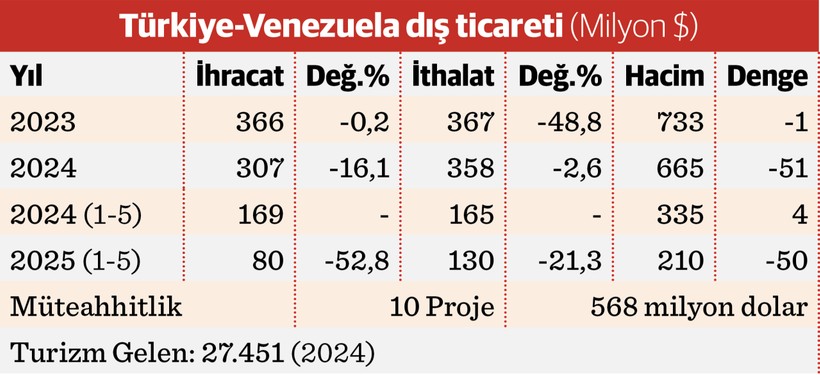 Bu ortada, Venezuela’ya ihracatta hububat, kimya, su ürünleri ve mobilya öne çıkıyor. İthalat ise çelik, kimya, hububat ve deri eserlerinde ağırlaşıyor.